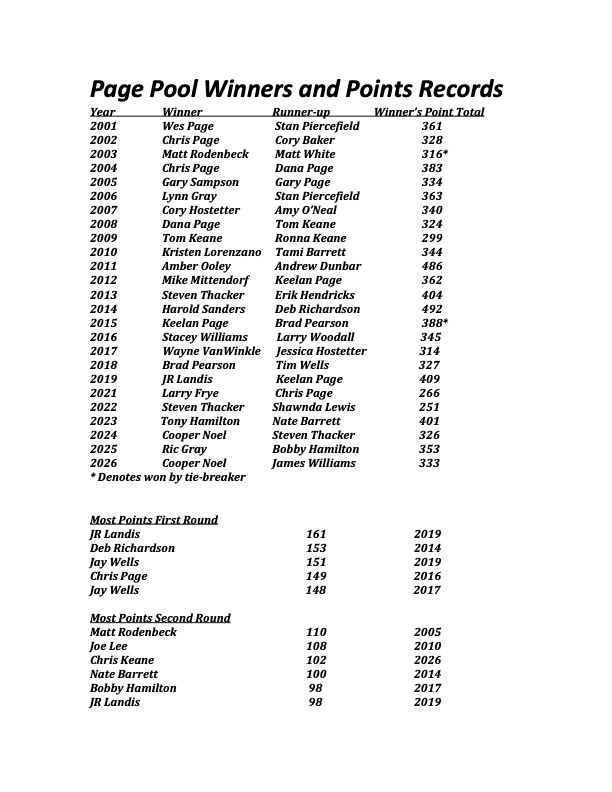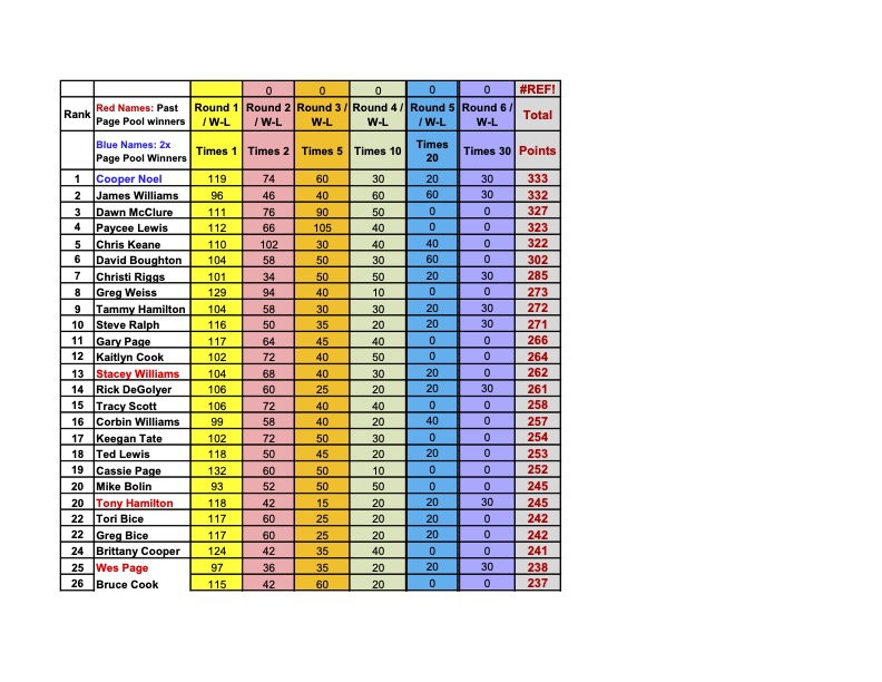 . The young man from Monrovia gets his 2nd Page Pool championship in 3 years…joining yours truly (who also won 2x in 3 yrs many moons ago) and Steven Thacker (2013 & 2022) as double winners. Very impressive performance my man! Your name will change from Red to Blue in the Standings from this point henceforth on this solemn 6th day of April in the year of our Lord 2026. We will call you up to the Platform @ HHC for your just reward in the near future. Big Shout to my bud